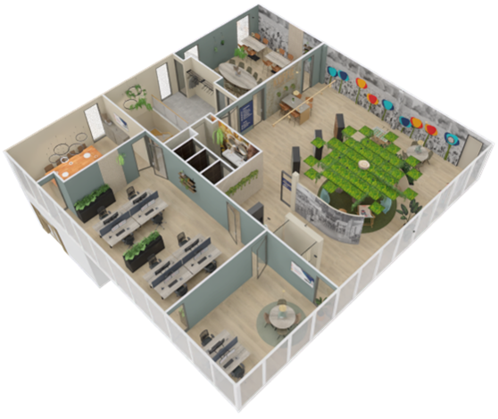🌿 In elke ruimte hebben we gewerkt met veel groen: planten zorgen voor een frisse, uitnodigende sfeer en versterken het gevoel van een levendige werkomgeving.