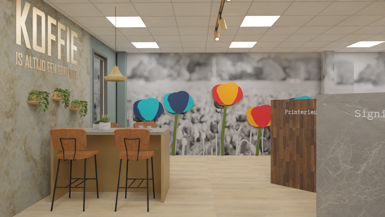 Voor De Jong Reclame mochten wij een interieurontwerp realiseren, zij zijn een ervaren bedrijf dat organisaties helpt zichtbaar te worden met een breed scala aan reclame- en signingoplossingen. Van voertuigbelettering tot gevelreclame, drukwerk en relatiegeschenken. Hun expertise is breed én persoonlijk.