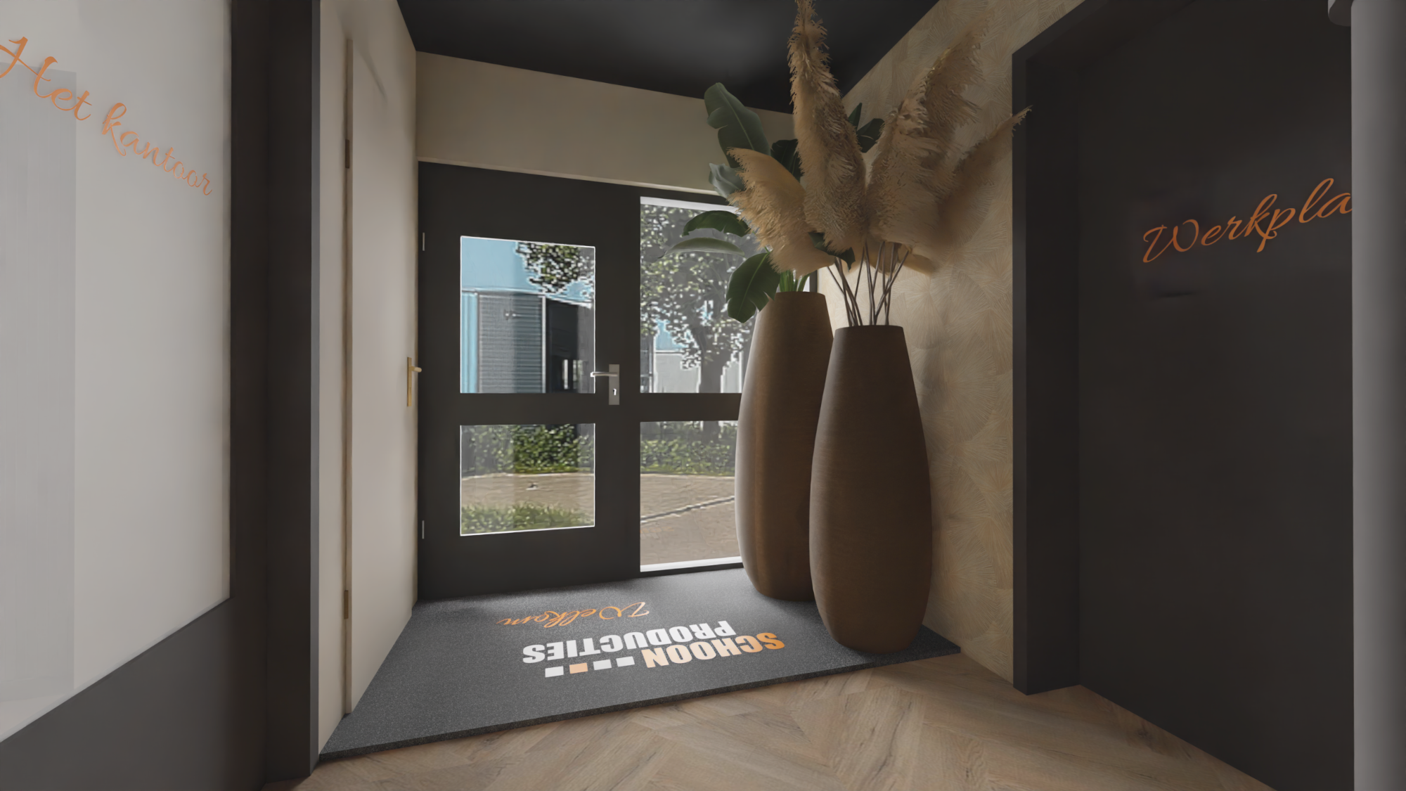 Omschrijving Een krachtig totaalconcept voor de nieuwe werkomgeving van SchoonProducties, volledig afgestemd op hun identiteit als videoproductiebedrijf.