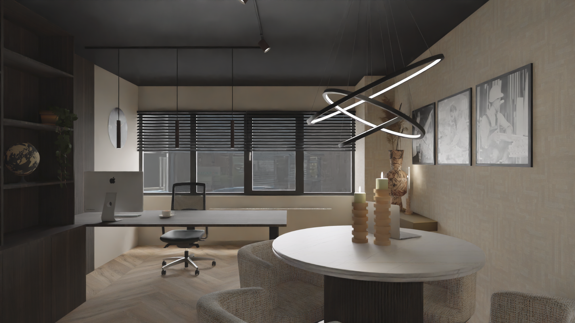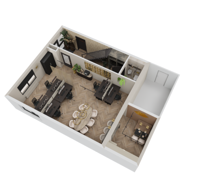 Het pand kreeg een volledige transformatie naar een hotel‑chique sfeer: van een uitnodigende entree en elegante kantoorruimtes tot een warme, sfeervolle kantine met bar. Luxe materialen, rijke texturen en een verfijnde, warme uitstraling vormen samen een interieur dat direct indruk maakt.